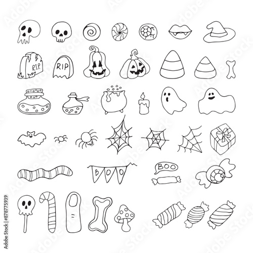 Naklejka premium images for Halloween Set of black and white. Pumpkin, Skull, Ghost, Gravestone, Spider, Candy, Broom, Hat, Eye, Potion, Bone, and more. Happy holiday. All objects are separated. Vector illustration.