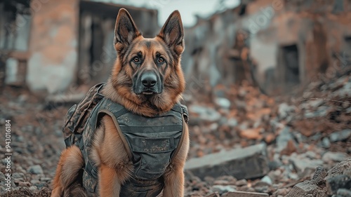 Fototapeta premium images of a military dog wearing tactical gear amidst the ruins of a war-torn...