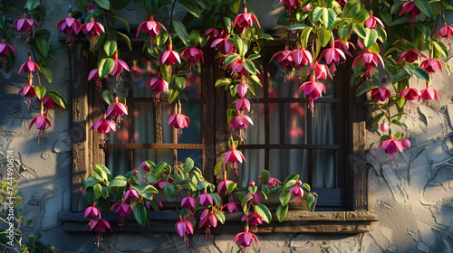 Fototapeta premium images of Fuchsia blooms adorning window boxes with architectural charm.