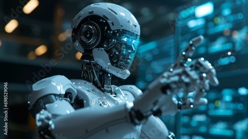 © Georgii, Fototapeta premium Imaginary illustration of android robot in front of touch screen in futuristic science lab. Artificial intelligence, robot engineering, innovation concept.