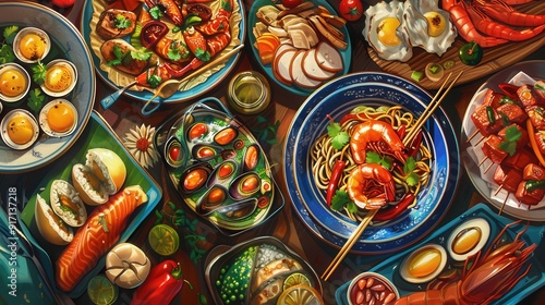 © wicha, Fototapeta premium Imagine a banner for a culinary festival. Describe the elements that capture the diversity of food offerings and the excitement of the event.