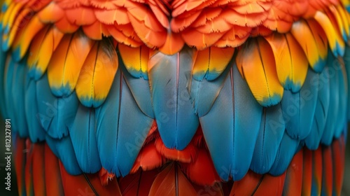 © Nawarit, Obraz premium Imagine a closeup of a scarlet macaws vivid feathers, highlighting the intricate patterns and colors inside an aviary