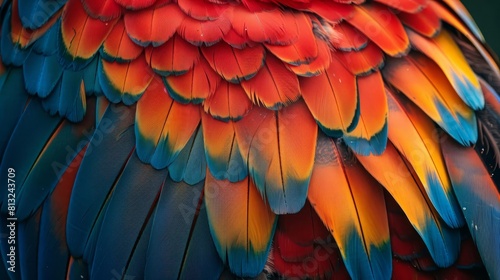 © Nawarit, Obraz premium Imagine a closeup of a scarlet macaws vivid feathers, highlighting the intricate patterns and colors inside an aviary