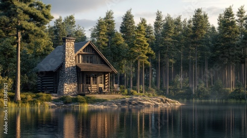 Obraz premium Imagine a cozy, rustic cabin by a lake, surrounded by tall pine trees and a stone chimney..