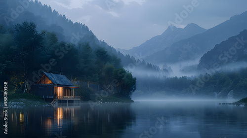 Fototapeta premium Imagine a serene cabin with misty mountain lake views at dusk, ideal for a tranquil nature retreat in the peaceful forest. The scenery is picturesque and perfect for relaxation