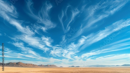 Fototapeta premium Imagine a vast desert landscape beneath an endless expanse of clear blue sky, with wisps of cirrus clouds adding a touch of texture and contrast to the stark beauty of the desert.