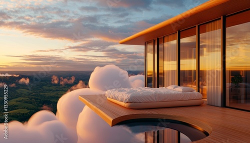 Fototapeta premium Imagine drifting into peaceful slumber upon a cloud-suspended bed, gently swaying amidst the ethereal beauty of a tranquil sky, where dreams intertwine with reality, as sunlight paints the heavens in