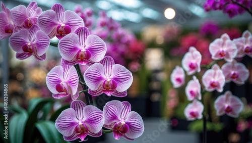 © DigitalDruid, Fototapeta premium Imitation Orchid Flowers. Soft Focus Background. Showroom Environment.
