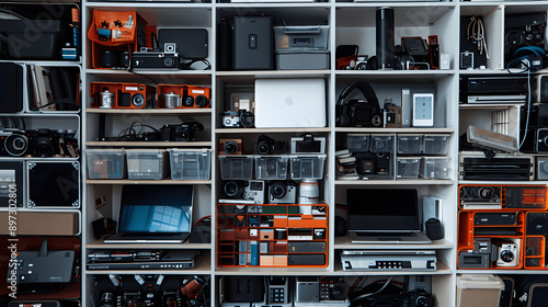 © Matthias, Obraz premium Immaculately neat storage shelf with stacked laptops and labeled bins