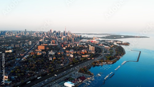Fototapeta premium Immense city with boundless river around Large stream of cars on highway and mighty skyscrapers humbly await end of day in city Retire on river bank, enjoy smooth surface of water after bustle in city