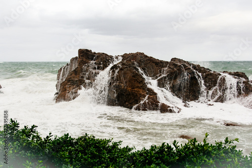 © Thales, Obraz premium Immense sea rock covered by a large wave. Force of nature.