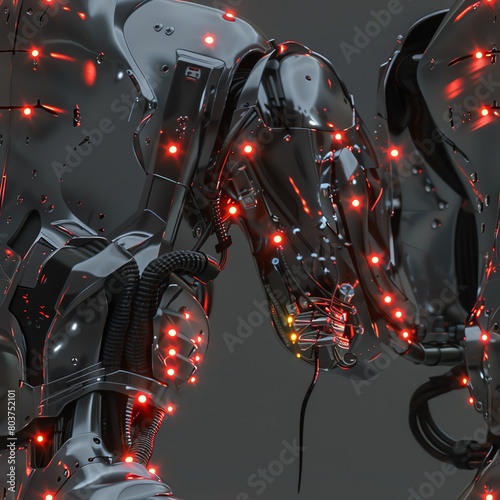 Fototapeta premium Immerse viewers in dystopian dread with a sleek, chrome exoskeleton, ominous red LED lights casting an eerie glow Include intricate wirings for added realism