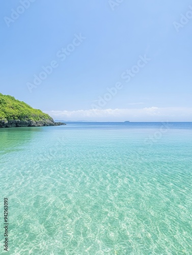 © Kanisorn, Obraz premium Immerse yourself in the tranquility of nature as pristine waters mirror a serene sky, offering a glimpse of pure beauty and peacefulness all around.