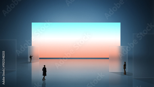 © Lustre Art Group , Obraz premium Immersive composition professionals interacting within expansive digital display space. Concept of virtual collaboration, user interface design, data environment and connected technology ecosystem.