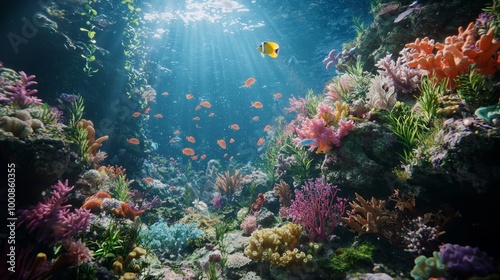 © Jakkarin, Naklejka premium Immersive 3D Rendering of a Lively Coral Reef Ecosystem with Diverse Marine Life