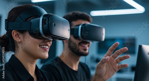 Fototapeta premium Immersive Virtual Reality Experience: Two Young Professionals Collaborate in a Modern Tech Office Using VR Headsets for Innovative Design and Development