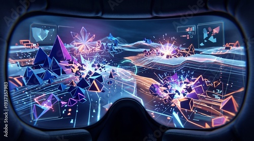 Fototapeta premium Immersive virtual reality world experience with glowing geometric shapes