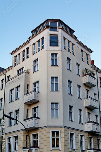 © Bruno Bleu, Fototapeta premium Immeuble gris en coin de rue, Berlin.