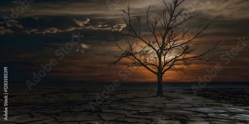 Fototapeta premium Impact of pollution on arid landscapes drought-stricken area environmental photo dramatic sunset conceptual vision