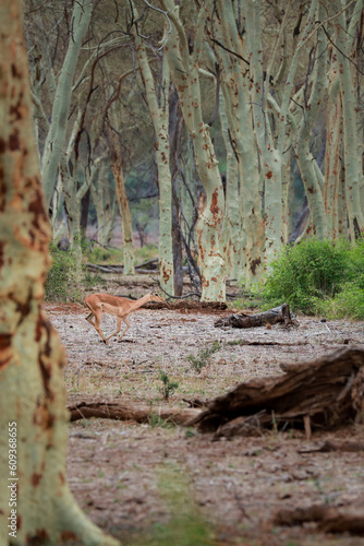 Obraz premium Impala running through clearing in a fever tree forest, Kruger National Park