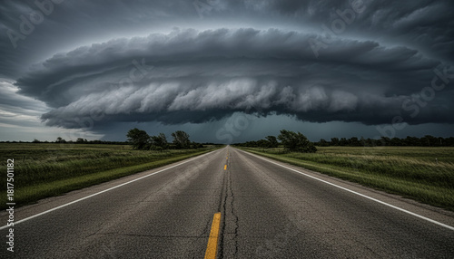 © Andrew505, Obraz premium Impending danger and uncertainty on the road ahead with a massive supercell storm cloud looming over a rural highway.