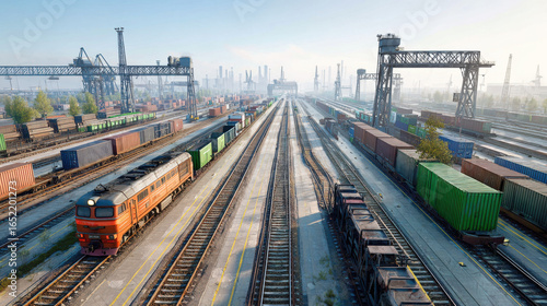 © PixelNexusArt, Fototapeta premium Import and trade activities thrive in this busy freight train yard where traffic of cargo containers moves efficiently