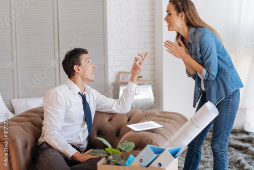 © zinkevych, Fototapeta premium Important talk. Friendly emotional couple looking interested while being at home and having an important conversation about their future