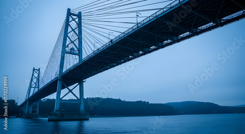 Obraz premium Imposing Cable Stayed Bridge Structure Over Calm Waters at Twilight Scenery
