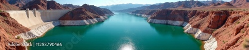 Fototapeta premium Imposing concrete dam; vast turquoise reservoir reflecting sunlight, development, massive
