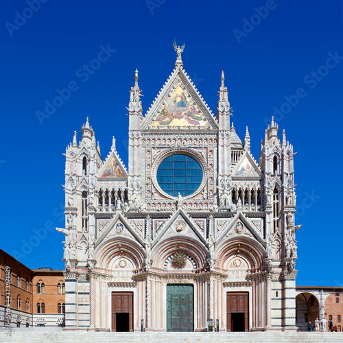 © Composer, Naklejka premium Impresje Toskanii w Sienie z bazyliką di san domenico we Włoszech.