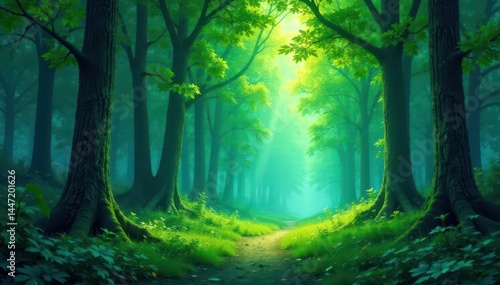 Naklejka premium Impressionist forest, textured greens & blues, dense canopy, branches, oil painting, green
