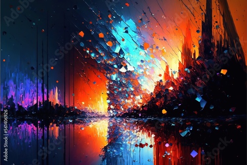© Picture Office, Naklejka premium Impressionistic blue red teal fire modern oil painting and sparkling wallpaper, color transitions, universe, volumetric lighting, sharp, hyperrealistic created with generative ai technology