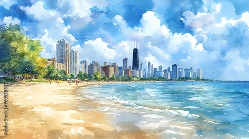 Naklejka premium Impressionistic Watercolor of Scenic Summer Beach and Skyline