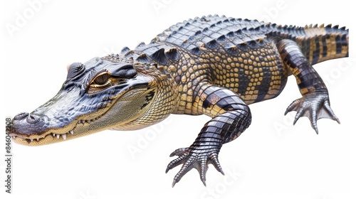 © Shozib, Fototapeta premium Impressive american alligator displaying its powerful presence with sharp teeth and tough scales, moving slowly against a plain white backdrop