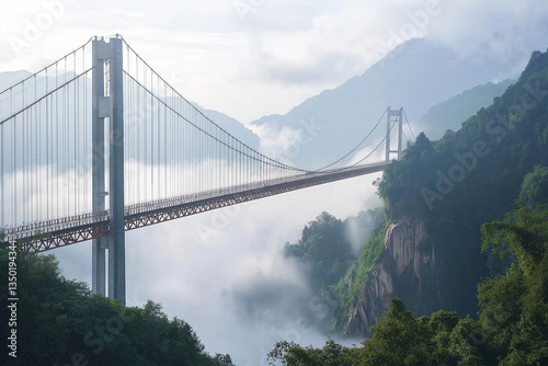 Obraz premium Impressive Large Suspension Bridge Spanning Deep Valley, Showcasing Architectural Brilliance and Engineering Marvel Amidst Nature