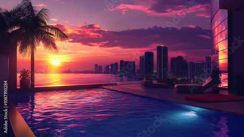 Obraz premium Impressive luxury penthouse terrace with infinity pool overlooking miami skyline at sunset 3d illustration