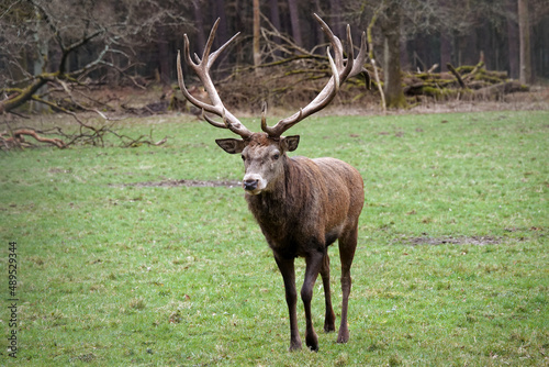 © Wolfborn Indiearts, Fototapeta premium Impressive male red deer is walking over a meadow. The stag has beautiful antlers.
