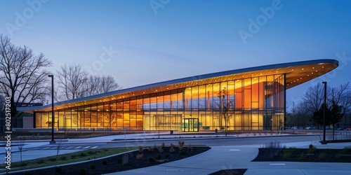 © sergio, Fototapeta premium Impressive modern glass and steel building with curved roof. AI.