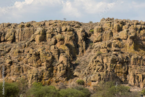 © juanjomenta, Fototapeta premium Impressive Rocky Cliff Formation Under a Partly Cloudy Sky with Verdant Vegetation Below
