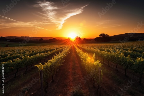 Fototapeta premium impressive view of vineyard at sunset, with the sun setting behind the rows of grapevines, created with generative ai
