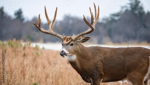 Naklejka premium Impressive Whitetail Buck Antler Rack Showcasing Majestic Majesty and Powerful Energy in a Stunning Display of Natures Splendor, Captured at Dusk.