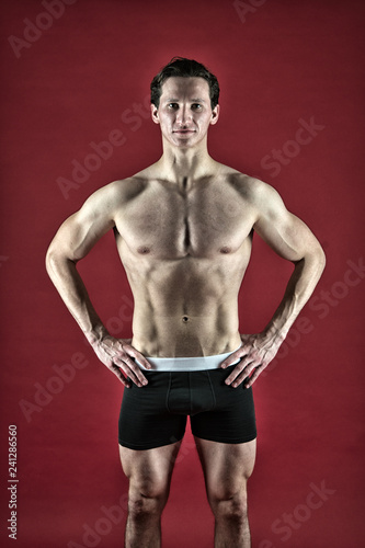 © be free, Fototapeta premium Improve yourself. Macho handsome with muscular torso. Attractive guy muscular chest. Muscular bodybuilder concept. Proud of excellent shape. Man muscular athlete stand confidently. Healthy and strong