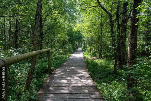 Fototapeta premium In a Birch forest with wooden path in red bog