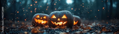 Naklejka premium In a dark forest, three illuminated jack-o'-lanterns are encircled by falling...