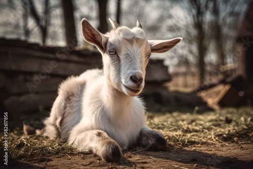 Fototapeta premium In a farm, a young goat is resting outside. Generative AI