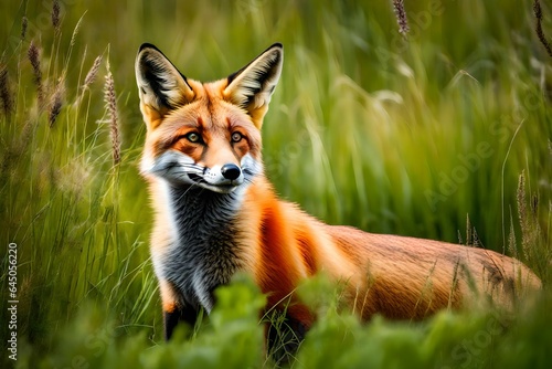 Fototapeta premium In a field's lush green grass and weeds, a lovely red fox image is depicted.