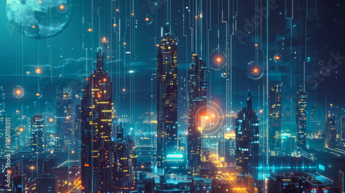 Fototapeta premium In a futuristic city powered by blockchain technology, citizens use cryptocurrency for public services, voting, and community governance.
