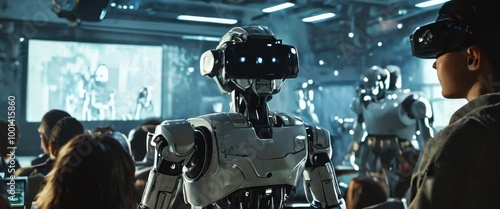 © Anastasiia, Naklejka premium In a futuristic high-tech environment, robots watch a presentation on large screens. The image highlights the integration of artificial intelligence and robotics in educational or corporate settings