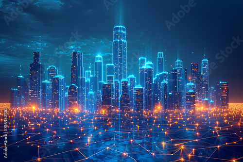 Fototapeta premium In a futuristic skyline, modern skyscrapers soar, defining the landscape of a smart city, symbolizing innovation, progress, and urban sophistication