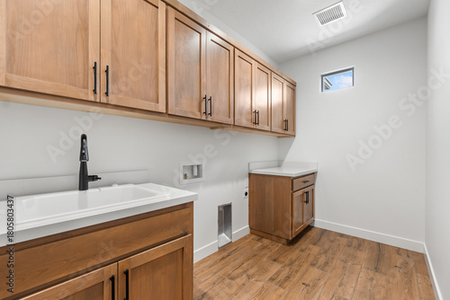 © Allison, Fototapeta premium In a laundry room, there are two blue washers and matching dryers